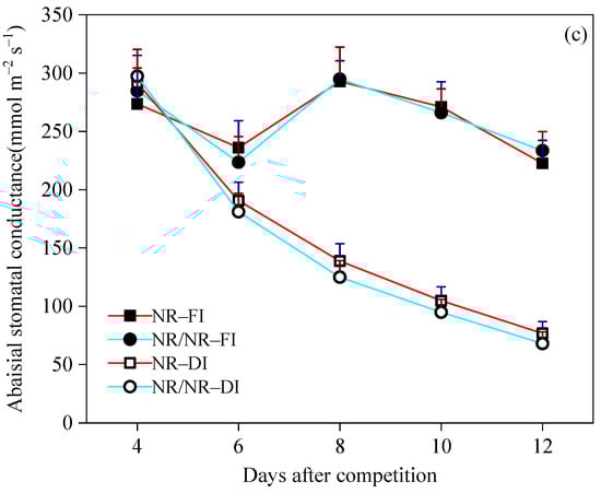 Variation of leaf area (a), transpiration (b), and abaxial stomatal conductance (c) of the single and competing plant of NR tomato under full irrigation and deficit irrigation (* p < 0.05).