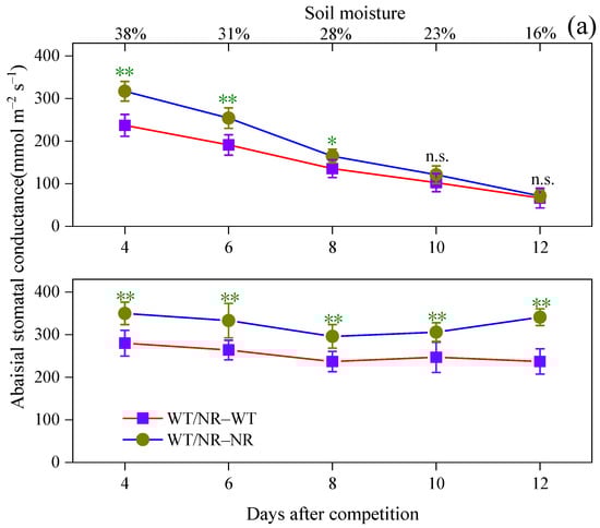 When growing WT and NR tomato in a pot, whether under full or deficit irrigation, the intraspecific competition did not reduce the NR plant’s leaf area, transpiration, and abaxial gs (Figure 4). In the WT/NR competing pot, the intraspecific competition had more significant influence on the gs of WT tomato (Figure 5a). Under the full irrigation, the gs of WT plant was averaging lower than that of NR plant by 22%. The difference in gs between the WT and NR tomato gradually decreased from 25% to 7% with a decrease in soil moisture. Moreover, this difference was not significant as soil moisture was lower than 28%. Overall, the distinct response to intraspecific competition between WT and NR tomato indicated that ethylene contributed to tomato response to intraspecific competition.