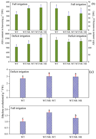 Abaxial stomatal conductance (mmol m−2 s−1), ABA content (ng g−1 DW), and ethylene evolution (nL g−1 FW) in competing WT plants under full irrigation and deficit irrigation. NC—without canopy competition, NR—without root competition. Data are means ± standard error (SE). Different letters denote statistically significant differences between treatments (p < 0.05).