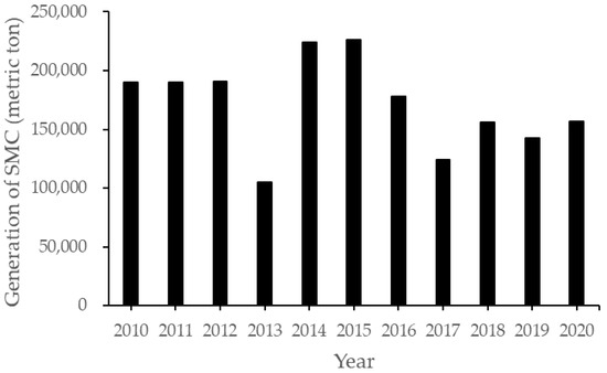 The global production of edible mushrooms has grown more and more significant in recent years as a result of the product being recognized as a healthy and organic food [1]. Most of the mushroom cultivation used compost as a substrate, which is comprised of lignocellulosic components like rice straw, corncob, saw dust and wood chips [2]. However, most of these substrates will become spent mushroom compost (SMC) after harvesting. According to the report [3], approximately 5 kg of SMC will be generated during the production of 1 kg edible mushroom. In Taiwan, annual SMC generation amounted 105–225 thousand metric tons since 2010, as shown in Figure 1 [4]. Although these agricultural residues can be mostly transformed into compost materials [4], some were dumped or stacked to the fields in Taiwan, thus causing environmental sanitation (odor) and plastic bag disposal problems [5]. In order to reach zero waste management, the approaches of SMC valorization were recently reviewed to utilize it as a valuable bioresource for producing value-added products/by-products and applications, for example, as a biochar adsorbent or soil amendment [2,6,7].
