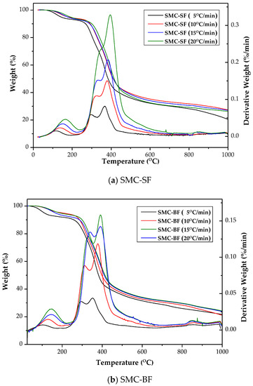 In general, the weight loss of lignocellulosic biomass, identified from the TGA/DTG curves, includes the following three regions [32]: loss of moisture (from room temperature to around 200 °C), loss of organic carbon (200–500 °C) and loss of small amounts of cellulose/lignin and carbonates/other inorganics (e.g., chlorides) in a range of 500–1000 °C. Figure 2 shows the TGA/DTG curves for the SMC samples (i.e., SF and BF) at various heating rates. It can be seen that the significant mass loss occurred in a range of 250–450 °C, indicating the thermal degradation of lignocellulosic constituents. Furthermore, the shoulder in the left side of the most significant peak at a temperature of about 300–330 °C should refer to as the degradation of hemicellulose and less parts of cellulose/lignin because the former may be the most labile components among the organic constituents (i.e., hemicellulose, cellulose and lignin) [8,32]. It should be noted that the complex reactions (e.g., dehydration, cracking, decarboxylation, condensation) involve depolymerization and scission during the most rigorous stage of pyrolysis. The formed products often include non-condensable gases (e.g., CO, CO2, CH4, H2), condensable gases or tar (e.g., H2O, formic acid, acetic acid, phenols and other organics) and char. In the final pyrolysis stage at above 400 °C, it should be attributable to the thermal decomposition of inorganic components (or minerals) with low melting/calcination points, and fewer parts of cellulose/lignin with rigid structures. Based on the results from the TGA/DTG curves (Figure 2), the pyrolysis conditions were designed in the range of 400–800 °C for producing porous biochar products from the SMC, where more cellulose/lignin components will be carbonized to form the carbon-rich products.