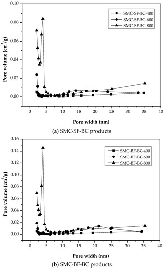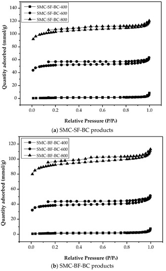The pore properties of the resulting biochar products (i.e., SMC-SF-BC and SMC-BF-BC) were derived from their N2 adsorption-desorption isotherms, as shown in Figure 3. Due to the adsorption filling by nitrogen adsorbate into micropores, the high uptakes were observed at relatively relative pressures, which reflects the Type-I isotherms according to the IUPAC classification [30]. However, the SMC-BC products produced at higher pyrolysis temperatures displayed the hysteresis loop, which was indicative of mesoporosity by the Type-VI isotherms. Accordingly, the resulting biochar products contain pore sizes over a wide range of micropores and mesopores. Using the BJH method [30], the data on the N2 adsorption-desorption isotherms can be further converted into their pore size distributions, as depicted in Figure 4. From the Figure 3 and Figure 4, they were highly related to those in Table 2 and Table 3. The differences between the pore properties of SMC-SF-BC and SMC-BF-BC products were also slight.