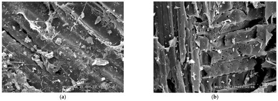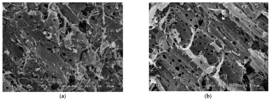 In order to observe the porous morphology on the surface of resulting biochar products, Figure 5 and Figure 6 showed the SEM images (×1000) of the SMC-SF/SMC-SF -BC-800 and SMC-BF/SMC-BF-BC-800, respectively. Obviously, there are many fine pores on the rigid surface of the representative biochar products, thus exhibiting their high pore properties such as the BET surface area and total pore volume, as seen in Table 2 and Table 3. Due to their highly porous structures, the SMC-based biochar products may be used as excellent adsorbents for various applications in the wastewater treatment and water retention in the soil and water environments.