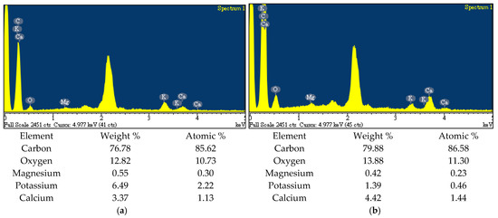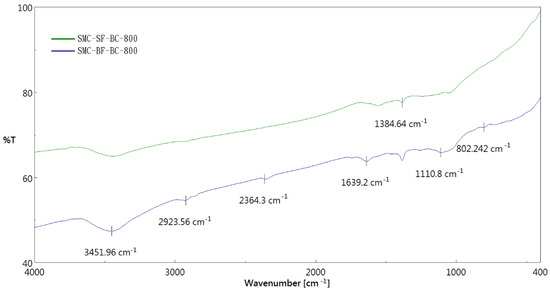 The chemical characterization of resulting biochar was highly dependent on its feedstock and preparation conditions. In this work, the EDS system was adopted to semi-quantify elemental compositions on the surface of the resulting biochar products [33]. Figure 7 showed the EDS spectra of the representative products (i.e., SMC-SF-BC-800 and SMC-BF-BC-800), indicating the contents of carbon (C), oxygen (O), magnesium (Mg), potassium (K) and calcium (Ca). The difference between their elemental compositions of the resulting biochar products also showed to be small in the resulting biochar products, which could be attributed to their similar thermochemical properties (Table 1). The high content of C present in the SMC-based biochar should be original from its starting feedstock and pyrolysis at high temperature (800 °C). The carbon element was primarily stored in condensed aromatic rings [34]. In addition, it showed the high content of oxygen on the biochar surface, causing its tendency toward hydrophilicity and acidity due to more oxygen-containing complexes [35]. This polar nature was further elucidated by the FTIR spectra. Figure 8 showed the FTIR spectra of SMC-SF-BC-800 and SMC-BF-BC-800. These peaks at about 3450, 2360, 1640, 1380 and 1110 cm−1 could be assigned with oxygen-containing functional groups (i.e., O-H, C=O, C-O) [36,37].