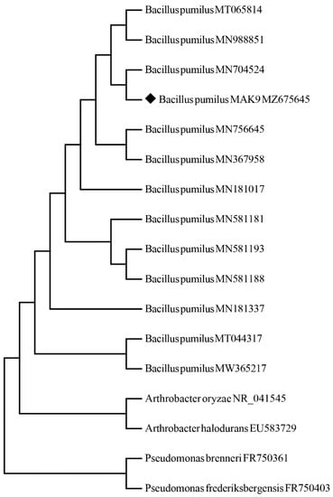 In total, 27 isolates were isolated and these were screened for plant growth-promoting traits (siderophore, phosphate, IAA, and EPS production). Based on the screening results, 16, 10, 12, and 12 isolates were positive for IAA production, siderophore activity, EPS production, and phosphate solubilization, respectively (Figure S1). Isolate MAK9 showed high tolerance to salt stress (Figure S2) and was, therefore, further investigated for molecular identification. Analysis showed that isolate MAK9 shared sequence identity with Bacillus pumilus; it was submitted to NCBI with the accession number MZ675645 (Figure 1).