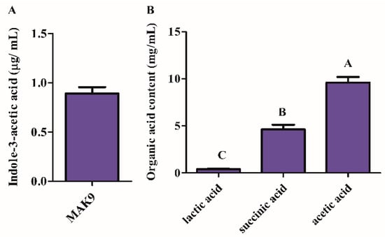 Quantification of indole-3-acetic acid (IAA) and organic acids produced by isolate MAK9. (A) GC/MS–SIM analysis of the IAA content in the culture broth of isolate MAK9. (B) Organic acids were detected and quantified using high-performance liquid chromatography relative to their respective standards. Different letters indicate significant differences between the mean values of three replicates ± standard deviation.
