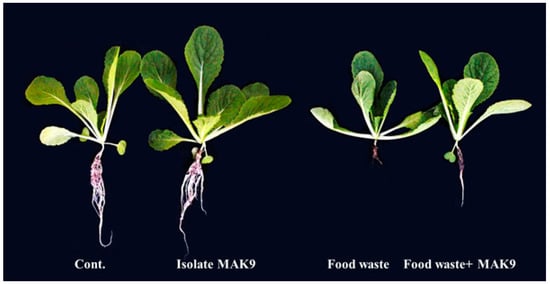 Chinese cabbage plant seeds were surface sterilized with 70% ethanol for 10 min and then washed three times with autoclaved distilled water. Petri dishes with two layers of filter paper were autoclaved; Chinese cabbage seeds were kept on wet sterile filter paper and incubated for 3 days at 27 °C for germination. Uniformly germinated seedlings were transferred to pots (10 × 9 cm2) containing autoclaved soil. Treatments were as follows: (1) control Chinese cabbage plants provided with autoclaved water, (2) bacteria-inoculated Chinese cabbage plants, (3) plants treated with food waste powder (Seyen Co., Ltd., Kyungsan, Korea) (8%), and (4) plants treated with food waste powder and inoculated with the isolate MAK9. After being transferred to pots, each plant was supplied with 10 mL of MAK9 cell suspension. The seedlings were normally lifted for the mutualistic association of bacteria and planted for about 2 weeks in the pots. Food waste was introduced as a treatment after two weeks. Food waste extract solution (10 mL; 8%) was applied to the pots every 3 days and this treatment was continued for ~2 weeks. The growth characteristics of the harvested plants, i.e., fresh and dry weight, root measurements, and shoot length were assessed after 20 days. Chlorophyll content was measured using a SPAD meter (SPAD-502 Minolta, Tokyo, Japan).