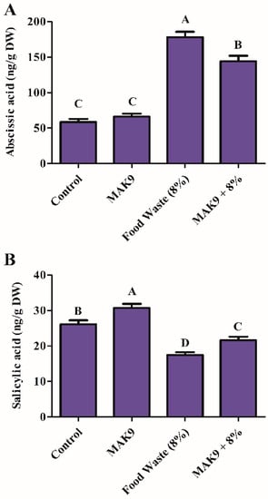 Endogenous abscisic acid (A) and salicylic acid (B) content in Chinese cabbage after food waste (8%) treatment and/or inoculation with isolate MAK9. Different letters indicate differences between the mean values of three replicates ± standard deviation.