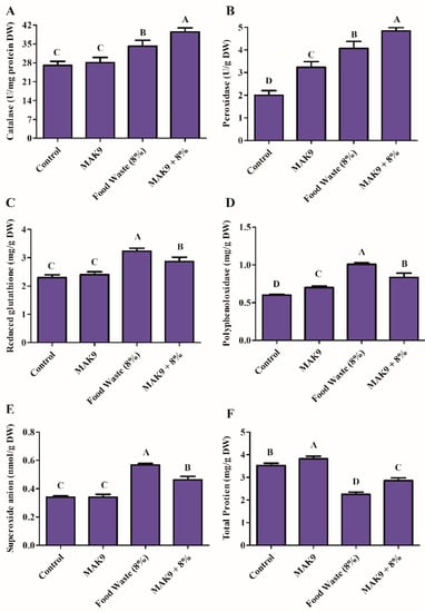 Effects of isolate MAK9 on antioxidant levels in Chinese cabbage with and without food waste (8%) application. (A) Catalase, (B) peroxidase, (C) glutathione, (D) polyphenol oxidase, (E) superoxide anions, and (F) total protein. Different letters indicate differences between the mean values of three replicates ± standard deviations.