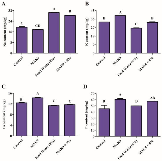 The effect of isolate MAK9 on the sodium (Na, (A)); potassium (K, (B)); calcium (C, (C)); and phosphorus (P, (D)) content of Chinese cabbage inoculated with isolate MAK9 and/or treated with food waste (8%). Different letters indicate differences between the mean values of three replicates ± standard deviations.