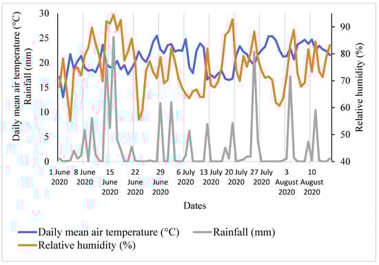 Daily mean air temperature (°C), rainfall (mm), and relative humidity (%) of the experimental field in summer 2020.