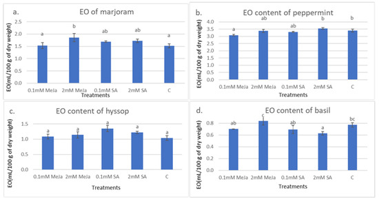 The effect of MeJa and SA on the EO content of the subject plants; (a) marjoram, (b) peppermint, (c) hyssop, and (d) basil; Data are expressed as means ± SD; means with different letters are significantly different (p < 0.05).