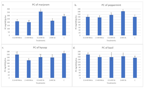 The effect of MeJa and SA on TPC of the subject species; (a) marjoram, (b) peppermint, (c) hyssop, and (d) basil; Data are expressed as means ± SD; means with different letters are significantly different (p < 0.05).