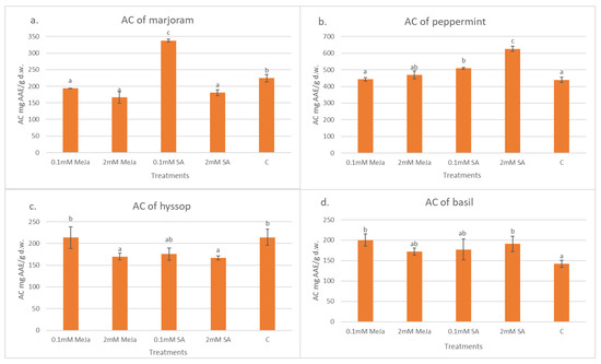 The effect of treatments on the AC of the four species (expressed by mg AAE/g d.w.) is demonstrated in Figure 4. The results closely correlate with the TPC data in all species and for all treatments. For both marjoram and hyssop, the treatments decreased the AC except for the lower dosage of SA treatment in marjoram, which showed a 50% stronger activity than the control. In hyssop, each treatment decreased the AC except for the lower dosage of MeJa. This is in contradiction to several reports about the effect of MeJa in elevating the AC; not only in healthy plants but also in plants subjected to water deficit stress, where this phytohormone presumably enhances the protection mechanisms [42,47,48].