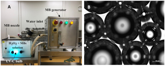 (A) The experimental setup for the combined treatment of hydrogen peroxide, UV-C, and MBs. (B) The image of MBs (30 to 110 µm) was taken by the Axiocam 503 mono microscope camera (Carl Zeiss Microscopy GmbH, Berlin, Germany). MB = microbubble; H2O2 = hydrogen peroxide. Bar = 100 µm.