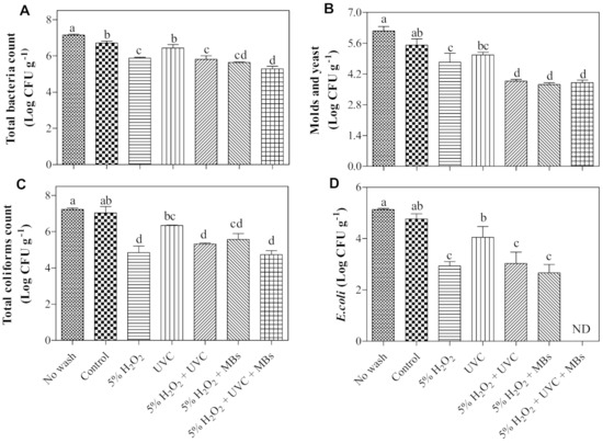 Effects of seed decontamination treatments on (A) total bacteria count, (B) molds and yeast count, (C) total coliforms count, and (D) Escherichia coli count in roselle seeds for microgreen production. Data are means of four replicates ± SE. Means with the same letter are not significantly different at p ≤ 0.05 by the DMRT test. ND = not detected.