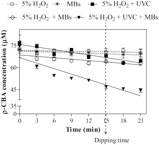 Changes in para-chlorobenzoic acid (ρ-CBA) concentration over time in different treatments. The dotted line indicated non-significant different regression relationship. (5% H2O2: y = 71.73, R2 = 0.04; MBs: y = 71.27, R2 = 0.06; 5% H2O2 + UV-C: y = −0.60x + 75.83, R2 = 0.61: 5% H2O2 + MBs: y = −0.32x + 68.63, R2 = 0.51; 5% H2O2 + UV-C + MBs: y = −1.24x + 71.27, R2 = 0.70). H2O2 = hydrogen peroxide, MBs = microbubbles.
