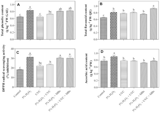 As shown in Table 3, the combined treatment of H2O2 + MBs resulted in a significantly heavier microgreen than the control. The other treatments did not have any adverse effect on the microgreens’ FW when compared to the control. Likewise, no significant differences were observed in total chlorophyll content and color (L, a*, and h° values) among the treatments or between the control. Nevertheless, the TPC in the microgreens was enhanced by H2O2, H2O2 + MBs, and H2O2 + UV-C + MBs treatments, recording an average of 27% higher than control; while no effects were observed from the UV-C- and H2O2 + UV-C-treated seeds (Figure 4A). Similarly, TAA by DPPH scavenging activity was remarkably elevated in microgreens produced from seeds treated with H2O2, H2O2 + MBs, and H2O2 + UV-C + MBs, resulting in an average of 68% higher than the control (Figure 4C). The TAA has also stimulated in microgreens of H2O2 + UV-C-treated seeds, but the rise of the activity was lesser than H2O2 and the combined treatments with MBs. There was no difference in the TAA between UV-C treatment and control. On the contrary, TFC increased significantly in microgreens grown from all treated seeds as compared to the control; whereby the highest TFC was obtained in microgreens grown from seeds treated with H2O2 + UV-C + MBs, exhibiting 41% higher than the control (Figure 4B). Apart from that, the elevation of ascorbic acid content was only observed in microgreens produced from seeds treated with H2O2, while the other treatments showed no significant changes when compared to the control (Figure 4D). Exogenous H2O2 treatment has been proven to induce the synthesis of phenolics and flavonoids content in quinoa sprouts [41]. Furthermore, H2O2 plays an important role as signaling molecules in acclimatization by inducing antioxidant defense mechanisms [16]. There are also studies suggesting that OH• radicals could play a signaling role in stress adaption in plants [42,43]. However, the role of OH• radicals or MBs of combined treatment, H2O2 + UV-C + MBs, in the induction of flavonoids in roselle microgreens developed from their corresponding seeds needs to be studied further.