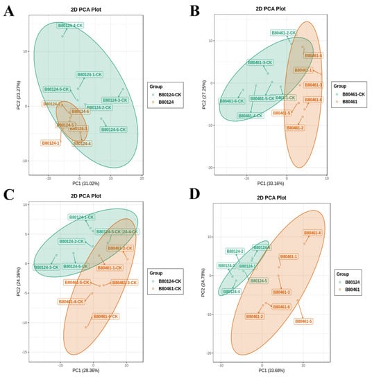 Principal component analysis (PCA) of samples between groups for difference comparison. The four groups were B80124-CK (“-CK” stands for the non-inoculated materials) and B80124 (A), B80461-CK and B80461 (B), B80124-CK and B80461-CK (C), B80124 and B80461 (D).