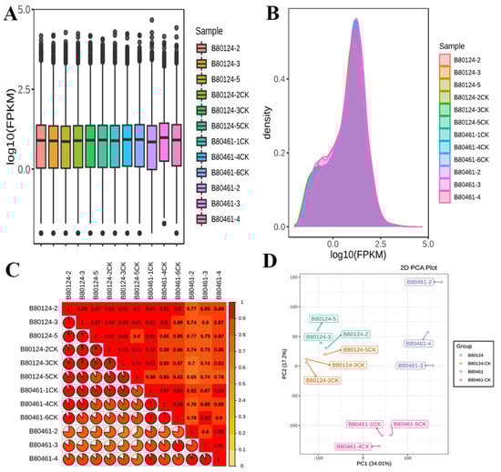 RNA sequencing was conducted on 12 samples, consisting of three independent biological replicates for each of line (B80124-CK, B80124, B80461-CK, B80461). Comparing the RNA sequencing date to the Brassica genome and TuMV reference genome, it was found that only three samples of B80461 were mapped to the TuMV reference genome, and the remaining nine samples were mapping to the Brassica reference genome and not to TuMV genome (Table S5). In addition, gene expression was detected by transcriptome analysis. Based on the fragments per kilobase of transcript per million fragments mapped (FPKM), the dispersion degree of gene expression level distributed in each sample was very similar, and overall gene expression levels were similar in each sample (Figure 3A). A density map showed the trend of gene abundance in the sample with the change in gene expression and clearly reflected the range of gene expression concentrations in the sample (Figure 3B). Furthermore, Pearson’s correction coefficient was analyzed, which revealed the corrections among all repetitive samples. The R2 values were all > 0.8, implying that the corrections among the three repetitive samples were reliable, and the data could be used in the subsequent analysis (Figure 3C). In addition to R2 values, PCA was also conducted to uncover the corrections among the repetitive samples. PCA suggested that the quality of the transcriptomic samples reach to the level for further analysis (Figure 3D).