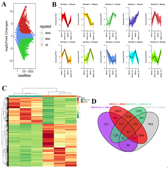DESeq2 software was used to count the differentially expressed genes, the total number of differential genes, the number of upregulated genes, and the number of downregulated genes in each group. The statistical results are shown in Table S6. There were 9376 differential genes between B80124 and B80461. From the MA analysis, after inoculating B. rapa with TuMV, there were more upregulated genes than downregulated genes (Figure 4A), which might be due to the stress response caused by the virus entering the plant. In addition, the upregulated and downregulated genes were classified through the standardized FPKM analysis. Clustering was performed with the k-means values. As shown in Figure 4B, the sub-class 3/7/8/10 obtained identical results, i.e., the FPKM values between B80124 and B80124-CK were similar, which were obviously different from the FPKM values between B80461 and B80461-CK (Figure 4B). There were changes in gene expression pathways between lines inoculated with TuMV and those that were not and between the resistant line (B80124) and the susceptible line (B80461). Notably, sub-class 1/2/4/6 showed irregular gene changes among the resistant/susceptible lines (Figure 4B). All differentially expressed genes were used to draw the cluster heat map, in which the upregulated and downregulated genes among the resistant/susceptible lines were shown (Figure 4C). The differentially expressed genes showed great changes before and after inoculation with TuMV in the resistant/susceptible lines. In addition, the Venn diagram among different combinations also showed differences in gene changes before and after inoculation of different lines with TuMV, which could indicate that biological stress can promote changes in the metabolic pathways of resistant materials (Figure 4D). There were only 95 common differentially expressed genes among B80124, B80124-CK, B80461, and B80461-CK.