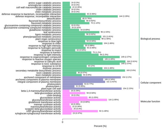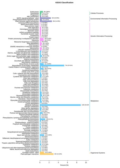 The Kyoto Encyclopedia of Genes and Genomes (KEGG) was analyzed to identify the different pathways. The differentially expressed genes were associated with five KEGG pathways (cellular processes, environment information processing, genetic information processing, metabolism, and organismal systems), and metabolic pathways in metabolism was the most frequent category (1207 different genes, accounting for 39.49%). The results were consistent with the metabolomic data (Figure 5), indicating that TuMV stress was related to metabolic pathways, especially focusing on defense response, flavonoid biosynthetic process, and toxin metabolic process (Figure 6). This indicates that TuMV stress maybe influence the release of VOCs; however, the further exploration for the mechanism of the interaction between TuMV and VOCs, are still necessary (Figure 7). In the plant–pathogen interaction after TuMV infected the plants, the hypersensitive response would upgrade, which could cause gene upregulation, such as that of NADPH oxidase, WRKY2, and MEKK (Figure 8). Notably, the elf18 gene played an important role in the interaction between plant and pathogen (Figure 8), which demonstrated that eukaryotic translation initiation factors (eIFs), such as eIF4E and eIF(iso)4E, could help plant pathogens replicate and spread in B. rapa, like retr01/retr02 [eIF(iso)4E], retr03 (eIF2Bβ).