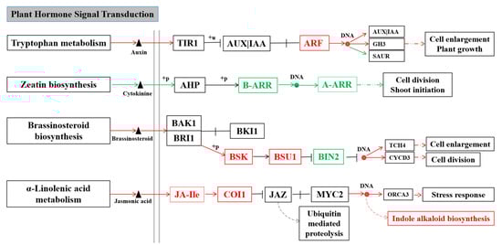 The destruction of viral infection to the normal plant developmental physiology is often related to plant hormone accumulation and changes in signaling changes. Changes in phytohormone levels have been repeatedly thought to be related to changes in virus accumulation [18]. In the process of virus–plant interactions, hormone signal-mediated plant resistance plays an important role in regulating the process of virus occurrence, such as symptom development, virus replication and virus movement [19,20]. Based on KEGG and gene ontology (GO) analysis, the different genes and metabolites between B80124 and B80461 were integrated into four signaling pathways related to plant hormone signal transduction, namely, tryptophan metabolism, zeatin biosynthesis, brassinosteroid biosynthesis, and α-linolenic acid metabolism (Figure 8). After inoculating with TuMV, auxin was upregulated, and ARF, IAA and GH3 were also upregulated, which accelerated cell enlargement and plant growth in tryptophan metabolism, AUX is mainly involved in plant growth and development, but also plays a role in plant defense [21] (Figure 8). The genes in zeatin biosynthesis pathways were downregulated, which reduced cell division and shoot initiation. However, the metabolite pathways were upregulated in brassinosteroid biosynthesis and α-linolenic acid metabolism, which could cause cell enlargement and a stress response (Figure 8). Jasmonic acid (JA) is mainly involved in plant defense against pathogens [22]. Some studies have found that jasmonic acid-mediated resistance is very important for regulating plant resistance to vector insects or plant viruses [23] (Figure 8).