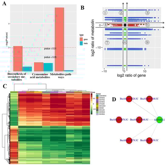 Integrated volatile metabolome and transcriptome analysis of volatile organic compound (VOC) accumulation in Brassica rapa. There were more differentially expressed genes than differentially expressed metabolites enriched in biosynthesis of secondary metabolites, cyanoamino acid metabolites, and metabolites pathways (A), Through Pearson’s correction coefficient (PCC) analysis for the different genes and metabolites, genes and metabolites had an inconsistent regulatory trend. Red dots indicate changes only at the metabolic level; Green dots indicate changes only at the gene level; Blue dots indicate changes at the metabolic level and gene levels. Black dots indicate both genes and metabolites were not differentially expressed (B), Heat map with Pearson’s correlation coefficient above 0.8 (C), Five pathways showed higher corrections after inoculation with TuMV. Green represents metabolites, red represents genes, solid lines represent positive correlations, and dotted lines represent negative correlations (D).