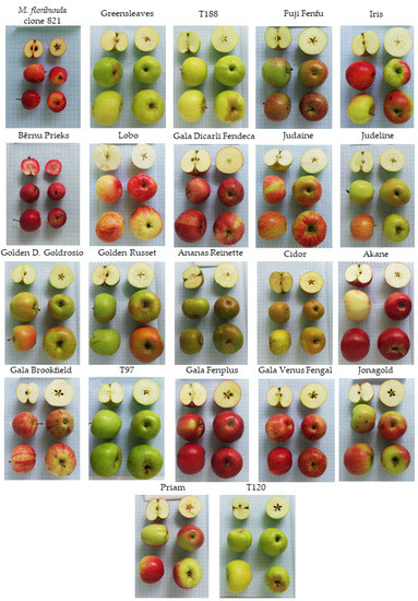 - UPOV. Apple, Fruit Varieties, Malus domestica Borkh. Guidelines for the Conduct of Tests for Distinctness, Uniformity and Stability TG/14/9; International Union for the Protection of New Varieties of Plants: Geneva, Switzerland, 2005. [Google Scholar]