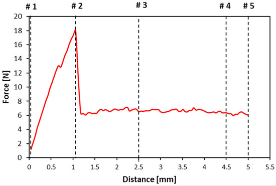 Example of force–distance curve obtained from CT3 Brookfield Texture Analyzer with results from a compression test of an unpeeled half apple sample. The computed textural parameters are described in Table 1, using the anchor numbers located on the upper edge of the curve.