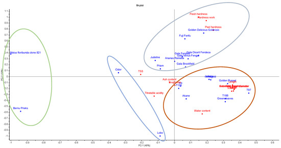 Principal component analysis (PCA) bi-plot for the 22 studied apple genotypes based on texture and physico-chemical quality attributes.