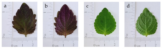 Leaves of microgreens of P. frutescens var. crispa (a,b), and var. frutescens (c,d). Upper leaf pages are shown in (a,c), lower leaf pages in (b,d), respectively.
