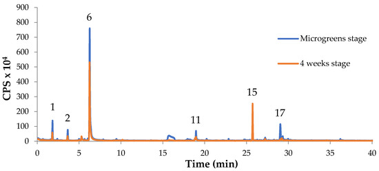 Comparison of VOCs of Chinese red basil (var. crispa) at microgreens stage and after further 4 weeks. The numbers of the peaks correspond to the volatile compounds identified (see Table 3).