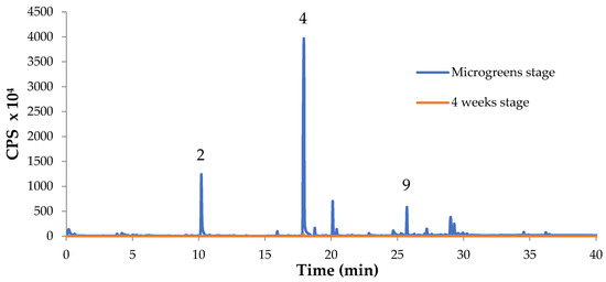 Comparison of VOCs of Chinese green basil (var. frutescens) at microgreens stage and after 4 weeks of further growth. The numbers of the peaks correspond to the volatile compounds identified (see Table 4).