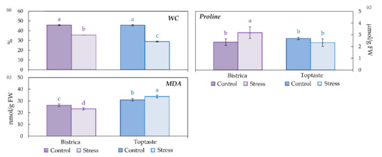 Water content (a), proline (b), and MDA content (c) in control and stressed leaves of plum cultivars Bistrica and Toptaste. Values are mean ± SD. Different letters indicate significant differences among the treatments and cultivars at p < 0.05 according to the LSD test.