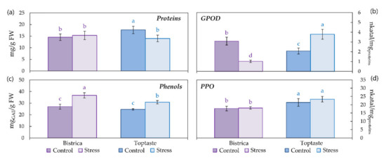 Soluble proteins (a), guaiacol peroxidase activity (b), phenols (c), and polyphenol oxidase activity (d) in control and stressed leaves of the plum cultivars, Bistrica and Toptaste. Values are mean ± SD. Different letters indicate significant differences among the treatments and cultivars at p < 0.05 according to the LSD test.