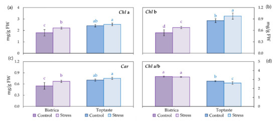Photosynthetic pigments, i.e., Chl a (a), Chl b (b), Car (c), and Chl a/b (d) in control and stressed leaves of the plum cultivars, Bistrica and Toptaste. Values are mean ± SD. Different letters indicate significant differences among the treatments and cultivars at p < 0.05 according to the LSD test.