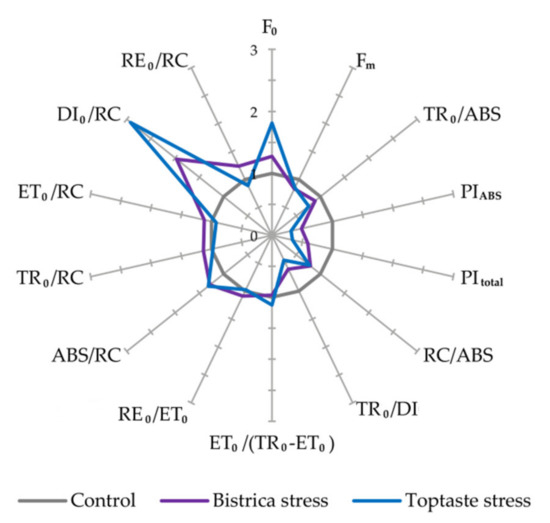 Within the components of the performance indexes, significant differences between the stress and control leaves were found only for the parameters named QA reducing RCs per PSII antenna Chl, i.e., the density of reaction centers on chlorophyll basis (RC/ABS) and the ratio of trapping and dissipation fluxes (TR0/DI0). The RC/ABS decreased in both cultivars similarly (21.44 and 23.30% in Bistrica and Toptaste, respectively), while diminution of TR0/DI0 was more pronounced in the stressed leaves of Toptaste (55.67%) than in Bistrica (39.64%), compared to the controls. The efficiency of the conversion of excitation energy to electron transport (ET0/(TR0 − ET0)) and the efficiency with which an electron can move from the reduced intersystem electron acceptors to the PS I end electron acceptors (RE0/ET0), remained the same in stressed leaves compared with the control, but the RE0/ET0 was lower in both (control and stressed) leaves of the cultivar Toptaste compared to the leaves of Bistrica.