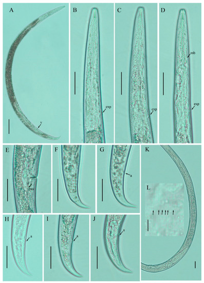 Photomicrographs of Nothotylenchus similis female. (A) Entire body; (B–D) pharyngeal regions; (E) vulval region; (F–J) tail regions; (K) posterior body to tail terminus; (L) lateral lines (arrowheads indicating the number of lines). Scale bars: (A) 50 µm; (B–K) 20 µm; (L) 5 µm. Arrowheads: (a) anus; (exp) excretory pore; (mb) median bulb; (pus) post-vulval uterine sac; (v) vulva.