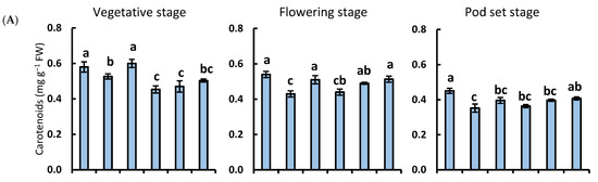 Effect of different treatments on (A) carotenoids, (B) total chlorophyll content, and (C) carotenoids/chlorophyll ratio of broad bean plants in 3 growth stages. The same letters indicate no significant difference (p < 0.05) as analyzed by the Duncan test. Each value is the average of 3 replicates ± SE.