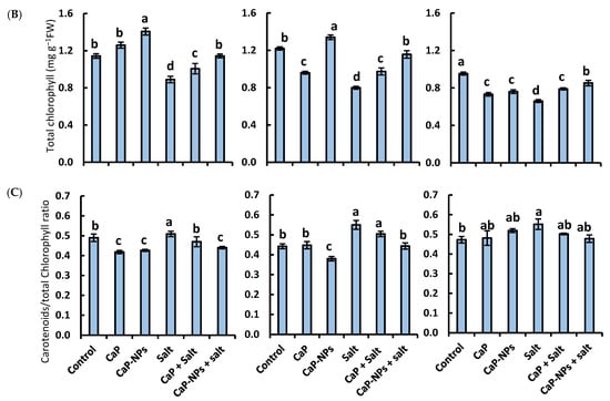 Compared with the control, carotenoids content decreased in response to CaP treatments in all stages (Figure 6A). However, CaP-NPs treatment was associated with significantly decreased carotenoids content during the pod set stage only. Exposure to salinity stress significantly decreased carotenoids by 22%, 19% and 20% during the vegetative, flowering, and pod set stages, respectively. Thus, the CaP-NPs nullified the inhibitory effect of salinity stress on carotenoid content at the flowering stage. Otherwise, both fertilizers failed to modify such effects significantly.