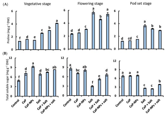 In the absence of salinity, CaP and CaP-NPs increased total soluble sugar by 47% and 90%, respectively, at the first developmental stage (Figure 7B). Except for the 17% decrease following application of CaP at the middle stage, both fertilizers were accompanied with insignificant change, compared with the corresponding control, in total soluble sugars at the flowering and pod set stages. Under salt stress, the CaP-NPs induced increase in soluble sugar content by 71%, 23%, and 43% at the vegetative, flowering, pod set stages, respectively, compared to non-stressed plants. Except at pod set stage applying CaP, both fertilizers intensified salinity-provoked soluble sugar accumulation at all stages with better performance for nano-fertilizer.