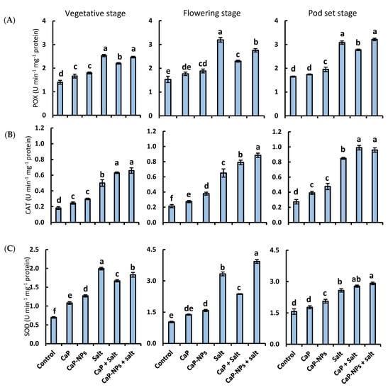At the vegetative stage, the CaP treatment showed an increase in proline content by 24% of the corresponding control (Figure 7A). Meanwhile, the CaP-NPs treatment enhanced proline content by 12%, 30%, and 24% at the vegetative, flowering, and pod set stage, respectively, compared with control (Figure 7A). Under NaCl stress, plants showed a marked accumulation in the interesting amino acid during all growth stages. Salt stress-induced proline accumulation was amplified by adding fertilizers at the vegetative stage that were more obvious when applying CaP-NPs. The amplification disappeared for CaP-NPs and reversed for CaP at the flowering stage; thereafter, it similarly reversed for both fertilizers at the pod set stage.
