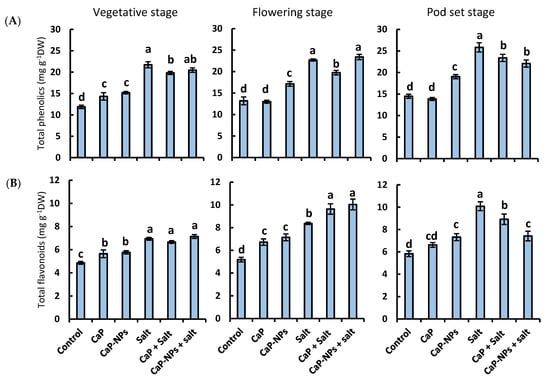 The CaP treatment increased the phenolics content by 21% at the vegetative stage and did not affect it at the following two stages (Figure 10A). On the other hand, the CaP-NPs elevated the content by 28%, 30%, and 31% compared to control at the three successive stages, respectively. Salinity exhibited a significant increase in total phenolic content by 83%, 72%, and 78%, respectively, at the sequential stages. CaP significantly ameliorated. The impact of salt stress on phenolics accumulation at all developmental stages was also observed for CaP-NPs but only at the pod set stage.