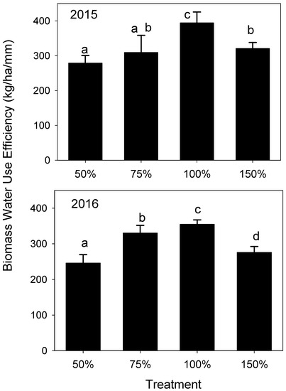 Water use efficiency of irrigation treatments for both trials, based on above ground biomass yields. Treatments are 50–150% of crop water requirement. Treatment means with different letters (a–d) are statistically different at the p < 0.05 confidence level. Error bars represent standard deviations of treatment means.