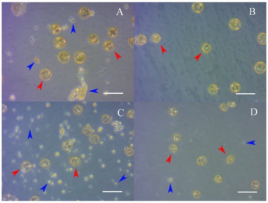 Preparations of spring radish ‘Ratnik’ (A,B) and European radish ‘RBK’ (C,D) under different isolation methods on the first day of cultivation. (A,C)—isolation method No. 2; (B,D)—isolation method No. 3. Red arrows are microspores; blue arrows are extrinsic grafts. Scale bars = 50 µm.