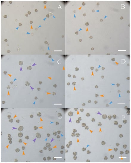 Preparations of mustard ‘Sudarushka’ on day 1 of cultivation with different methods of isolation and sizes of buds. (A,C,E)—microspore isolation number 2; (B,D,F)—microspore isolation number 3; (A,B)—bud size 2.5–2.9 mm; (C,D)—bud size 2.9–3.3 mm; (E,F)—bud size 3.3–3.7 mm; blue arrows—microspore fraction No. 1; orange arrows—microspore fraction No. 2; lilac arrows—microspore fraction No. 3. Scale bars = 50 µm.