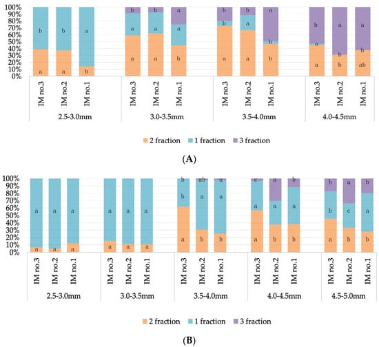 (A) Ratio of different fractions of microspores in a population of spring rapeseed ‘Ratnik’ microspores according to bud size and method of isolation: 1 fraction—very early developmental stages; 2 fraction—optimal developmental stages for embryogenesis induction; 3 fraction—late developmental stages. IM—isolation method. Diagram ranges with the same letter (comparison of the fraction percentage in the population of microspores within the same fraction (same color) and the same bud size) are not significantly different with 95% probability according to the Duncan multiple range test (MRT). Data from two-way analysis of variance (ANOVA) and the contribution of the influence of factors are presented in Table S2. (B) Ratio of different fractions of microspores in the European radish ‘RBK’ microspore population according to bud size and method of isolation: 1 fraction—very early developmental stages; 2 fraction—optimum developmental stages for embryogenesis induction; 3 fraction—late developmental stages. IM—isolation method. Diagram ranges with the same letter (comparison of the fraction percentage in the population of microspores within the same fraction (same color) and the same bud size) are not significantly different with 95% probability according to the Duncan multiple range test (MRT). Data from two-way analysis of variance (ANOVA) and the contribution of the influence of factors are presented in Table S2.