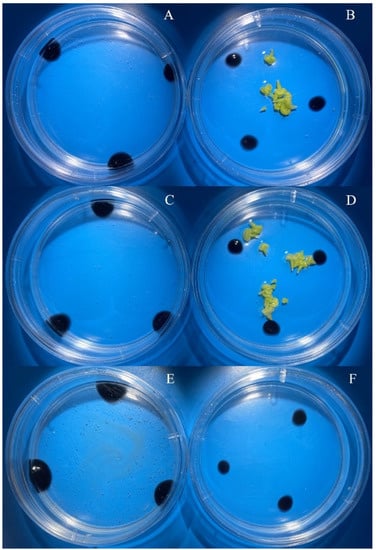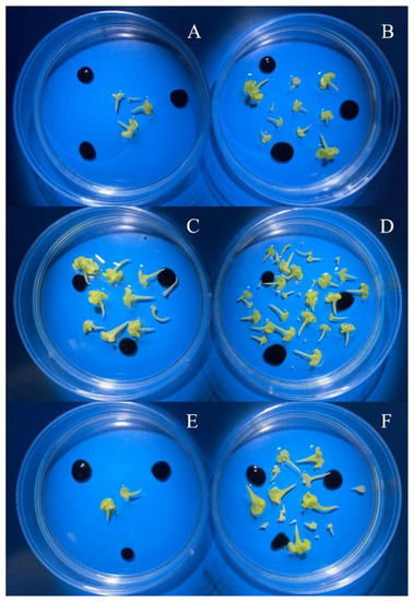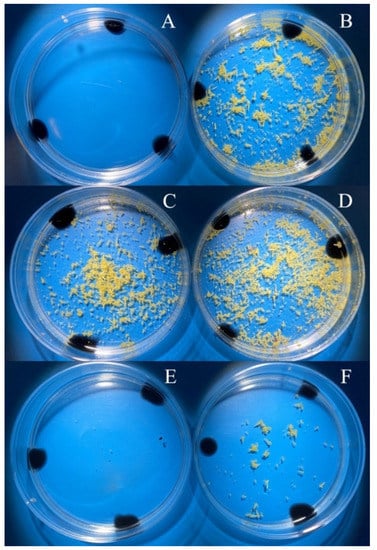 Yield of spring rapeseed embryoids ‘Ratnik’ at day 30 of culture depending on the method of isolation and linear size of buds. (A,C,E)—microspore isolation No. 2; (B,D,F)—microspore isolation No. 3; (A,B)—bud size 3.0–3.5 mm; (C,D)—bud size 3.5–4.0 mm; (E,F)—bud size 4.0–4.5 mm.