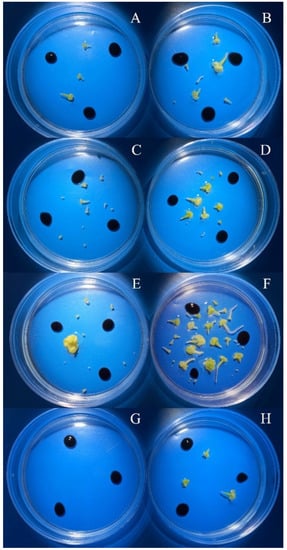 Yield of white cabbage ‘Parus’ embryoids at day 30 of culture depending on method of isolation and linear size of buds. (A,C,E,G)—microspore isolation No. 2; (B,D,F,H)—microspore isolation No. 3; (A,B)—bud size 4.0–4.5 mm; (C,D)—bud size 4.5–5.0 mm; (E,F)—bud size 5.0–5.5 mm; (G,H)—bud size 5.5–6.0 mm.